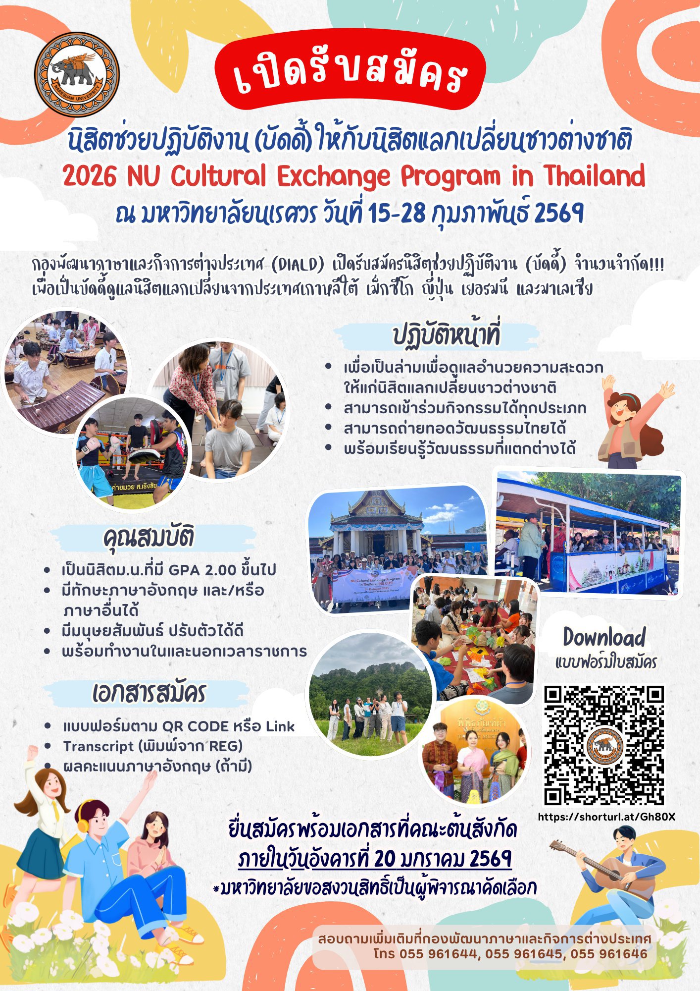 รัฐบาลสาธารณรัฐประชาชนจีนได้เสนอทุนการศึกษา ASEAN-China Young Leaders Scholarship Programme (ACYLS) .. อ่านต่อ >>   29 ม.ค. 2569 Shinshu University ประเทศญี่ปุ่น ประชาสัมพันธ์เปิดรับสมัครนิสิตจากมหาวิทยาลัยนเรศวร จำนวน 1 ราย ภายใ.. อ่านต่อ >>   29 ม.ค. 2569