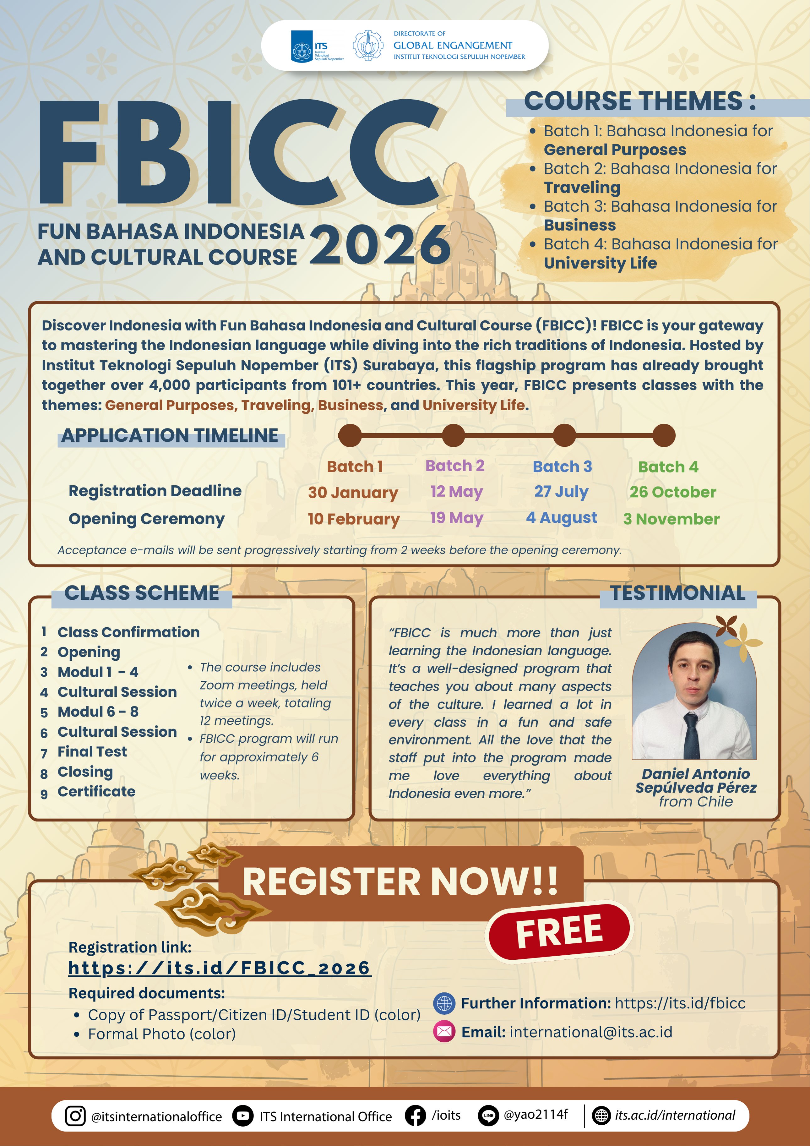 The Institut Teknologi Sepuluh Nopember (ITS) ประเทศอินโดนีเซีย ประชาสัมพันธ์ “Fun Bahasa Indonesia and Cultural Course 2026 (FBICC)” ระหว่างวันที่ 10 กุมภาพันธ์ – 17 มีนาคม 2569 อ่านต่อ >>   22 ม.ค. 2569