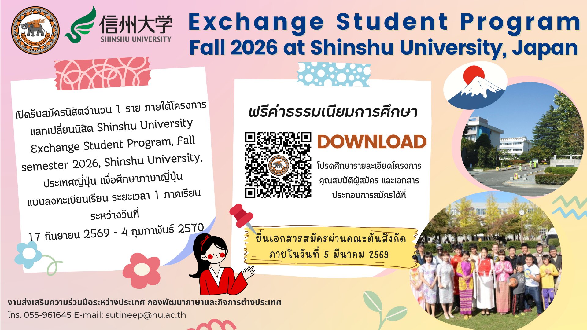 Shinshu University ประเทศญี่ปุ่น ประชาสัมพันธ์เปิดรับสมัครนิสิตจากมหาวิทยาลัยนเรศวร จำนวน 1 ราย ภายใต้โครงการแลกเปลี่ยนนิสิต Shinshu University Exchange Student Program, Fall 2026 ณ Shinshu University ประเทศญี่ปุ่น อ่านต่อ >>   29 ม.ค. 2569