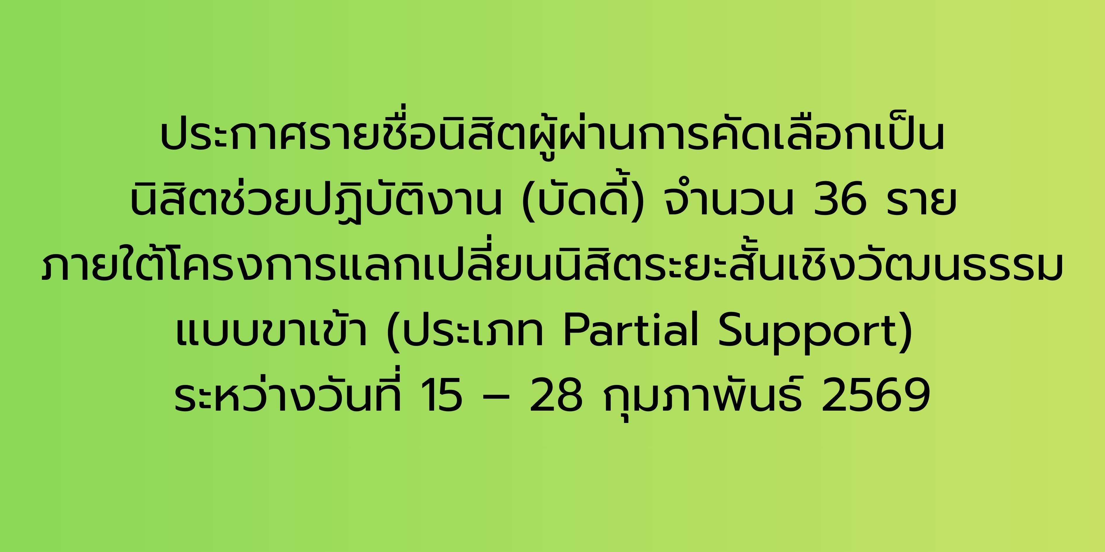 ประกาศรายชื่อนิสิตผู้ผ่านการคัดเลือกเป็นนิสิตช่วยปฏิบัติงาน (บัดดี้) จำนวน 36 ราย ภายใต้โครงการแลกเปลี่ยนนิสิตระยะสั้นเชิงวัฒนธรรม แบบขาเข้า (ประเภท Partial Support) อ่านต่อ >>   4 ก.พ. 2569