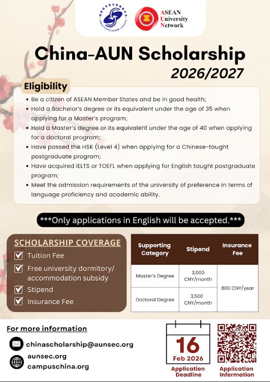 ASEAN University Network (AUN) ประชาสัมพันธ์ทุนการศึกษาโครงการ China-ASEAN scholarship programmes for Academic Year 2026/2027 อ่านต่อ >>   5 ก.พ. 2569