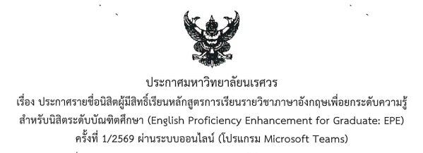 ประกาศรายชื่อนิสิตผู้มีสิทธิ์เรียน EPE (English Proficiency Enhancement for Graduate) 1/2569 (พ.ย.-ธ.ค.68) อ่านต่อ >>   17 ต.ค. 2568